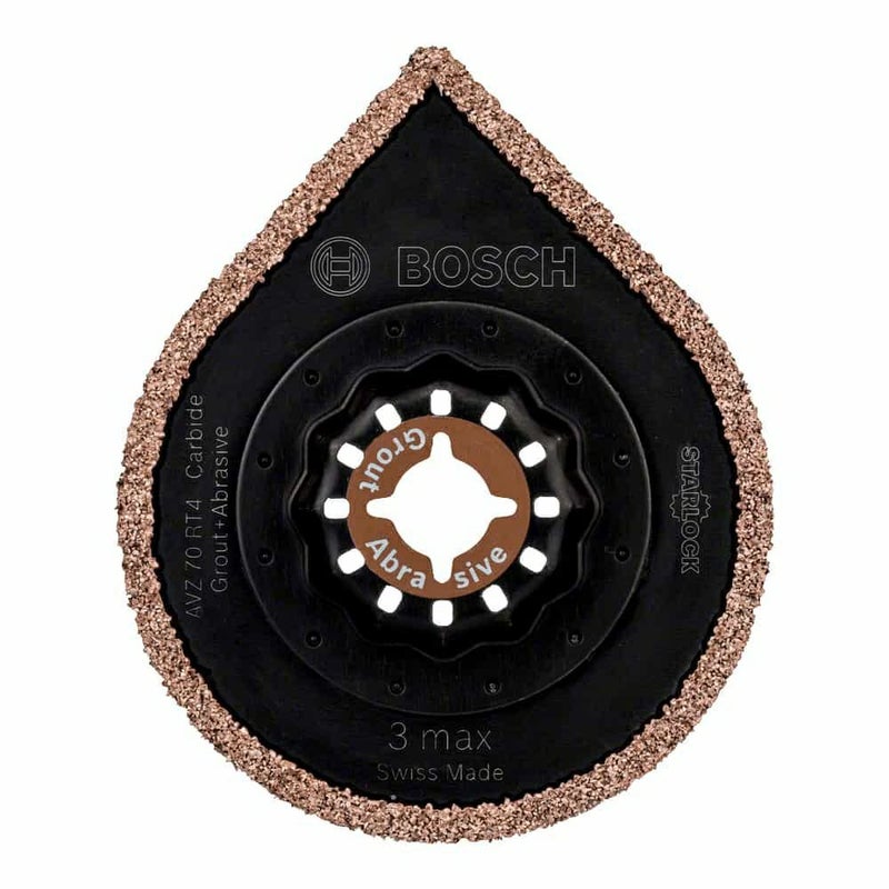 Starlock AVZ 70 RT4 3 max 除去具は、1 台 3 役の機能を備えています。 1 つ目の機能は、質の高いカーバイド素材でコーティングされた円形チップです。狭い隅の部分の目地材やモルタルも簡単に除去できます。 2 つ目の機能は、プレートの刃先です。タイル間の目地材を効率的に削ぎ取ることができます。 3 つ目の機能は、カーバイド グリット コーティングです。モルタルやタイル接着剤を手早く効率的に取り除けます。 この多機能アクセサリーを使って、タイル目地、多孔質コンクリート、軟質レンガの削ぎ取り作業を行えます。 さらに、狭い隅の部分の接合剤の除去作業や、セメント接合繊維板と繊維強化複合材料の凹み加工も可能です。 通常のマルチツールのほか、Starlock システム、Starlock Plus システム、Starlock Max システムのすべてで使用できます。