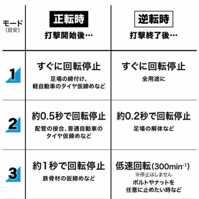 連続した仮締め作業から、緩め作業時のナット落下防止に、各3段階の正逆転オートストップモードを搭載しています。また、スイッチ全速モードで効率良く連続作業が行え、スイッチ操作の疲労も軽減されます。