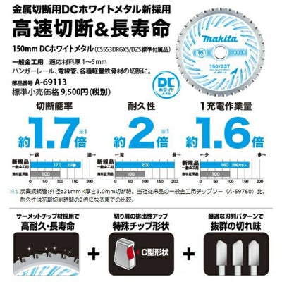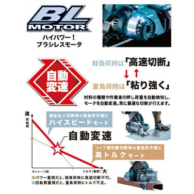 ハイパワーブラシレスモータ搭載。薄板金切断等の軽負荷時は高速切断が可能なハイスピードモード、リップ溝形鋼切断等の重負荷時は粘り強い高トルクモードと、材料の種類や作業者の押し負荷を自動検知してモータを自動で変速する自動変速機能付。リップ溝形鋼(Cチャン)も一発切断。