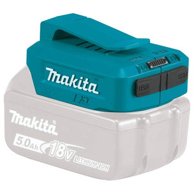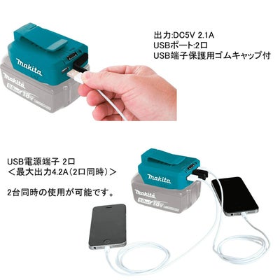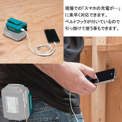 のマキタの14.4Vまたは18V充電池をセットすると、USB電源として使用が可能です。スマートフォンの充電や、レーザー墨出し器の電源にお使いいただけます。
