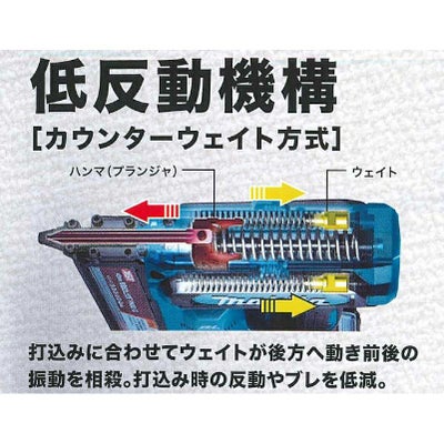 - 打ち込みに合わせてウェイトが後方へ動き前後の振動を相殺。打ち込み時の反動やブレを低減する低反動機構を搭載しています。