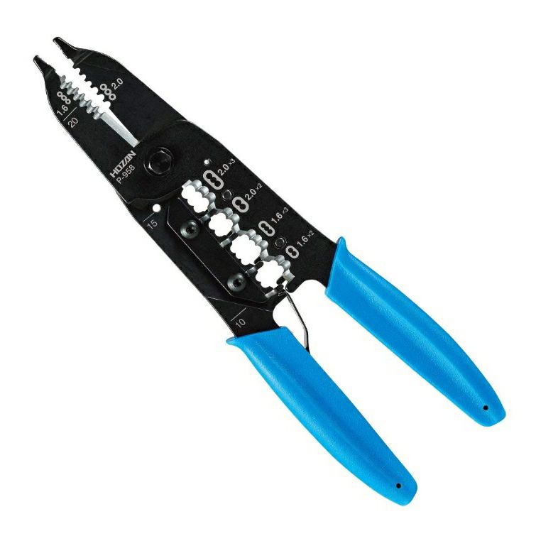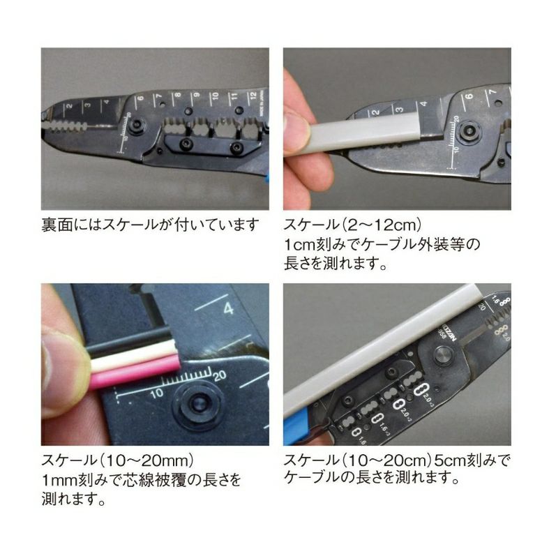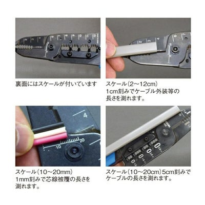 VVFケーブル2.0mm×3芯に対応「測る」「剥く」「切る」「のの字曲げ」作業がこの工具一本で可能です。エコ電線(EM-EEFケーブル)も軽い力でストリップできます。