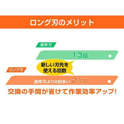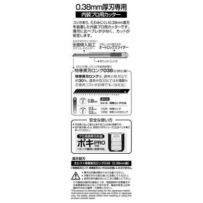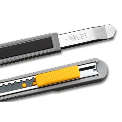 1枚で新しい刃先が21回使えてお得な、特専黒刃ロング038を装着したオートロック式小ロング型カッターナイフ。