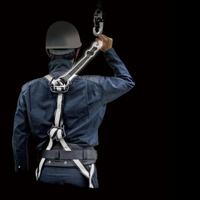 安全ブロックのフックを外した後は、接続ストラップを面ファスナーで肩ベルトに留められるので邪魔にならない。