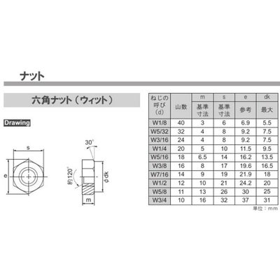 ウィット規格(インチ)のナットです。建築などに使用されることが多いです。錆びにくいステンレス製。